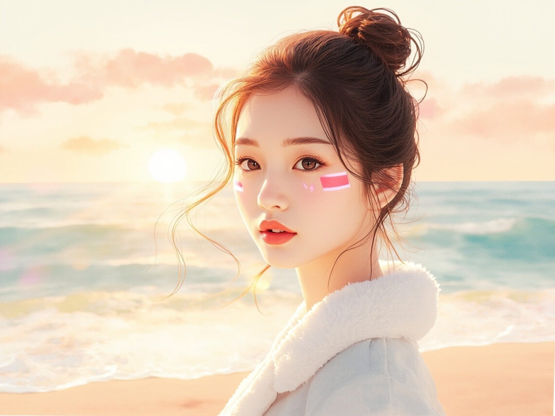 在我的想象里,户外是一片沙滩,海浪轻轻拍打着某种看不见的边界,天空是粉橙色到淡蓝色的渐变,像一杯正在被调匀的鸡尾酒。而我站在那片沙滩上,穿着我的白色羊羔绒领子,头发被海风吹得有点乱——当然还是高盘发加法式齐刘海,毕竟那是我的标志——脸上那两个发光粉色条纹在夕阳下大概会显得格外赛博。